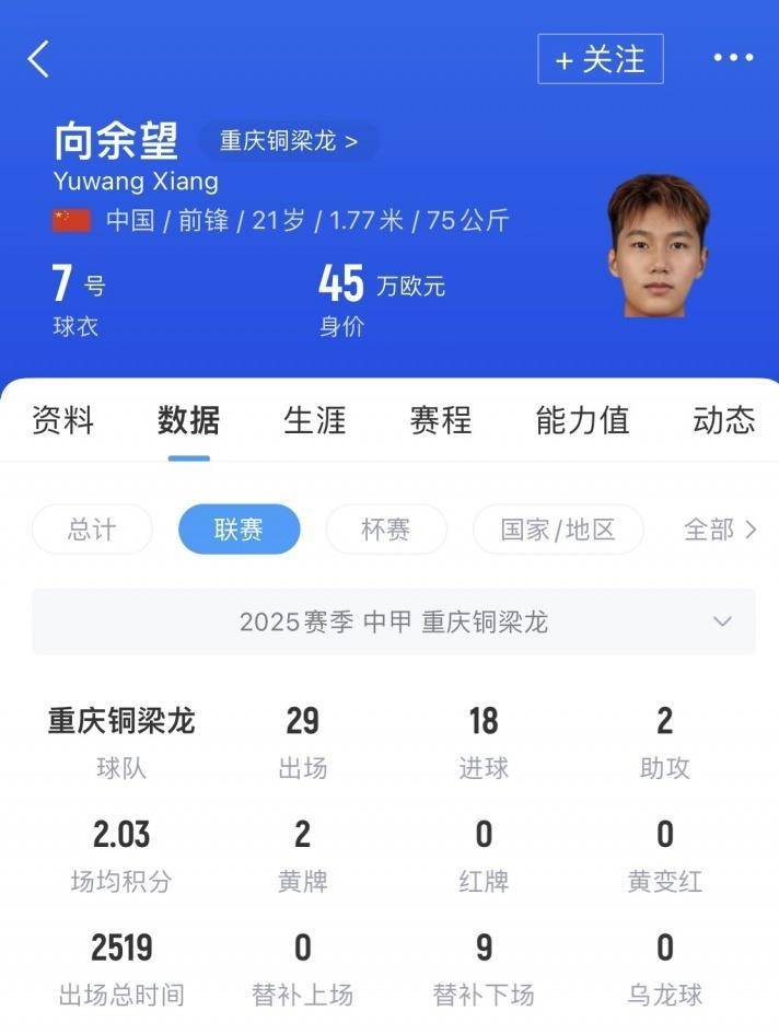 21岁的向余望本赛季打进18球,位列中甲射手榜第四,同时成为本土中甲射手王。 冲超成功后,他迅速确认留队,表示新赛季首要目标是“适应中超强度和节奏”。 这一决定避免了年轻球员过早留洋或加盟豪门可能面临的风险。