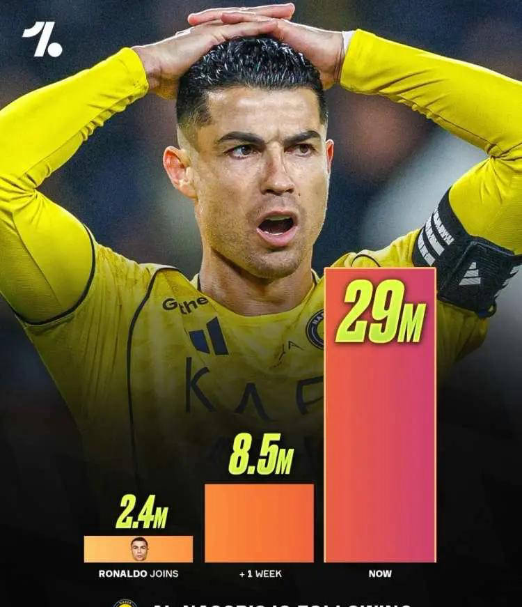 更令人瞩目的是,C罗加盟之前,利雅得胜利该平台的粉丝数仅为240万,加入C罗后,这一数字直接增长了十倍以上。这些数据充分体现了C罗带来的巨大商业和品牌效应。然而,一些媒体也指出,尽管C罗与沙特联赛管理层目前达成了和解,看似“破镜重圆”,但双方间出现的裂痕深刻且难以完全消除。外界普遍预计,未来C罗很有可能会告别利雅得胜利与沙特联赛,其中最快的时间节点可能是在2026年美洲杯或美加墨世界杯结束后。