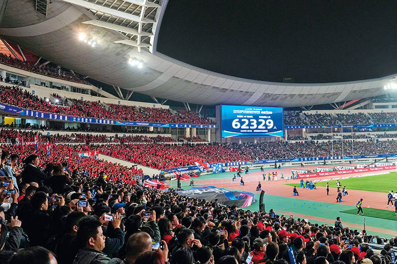 在江苏南京举行的 2025 江苏省城市足球联赛(“苏超”)决赛现场,大屏幕显示共有 62329 名观众观赛(2025 年11 月 1 日摄) 李博摄 / 本刊