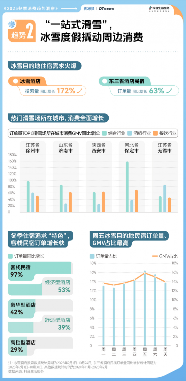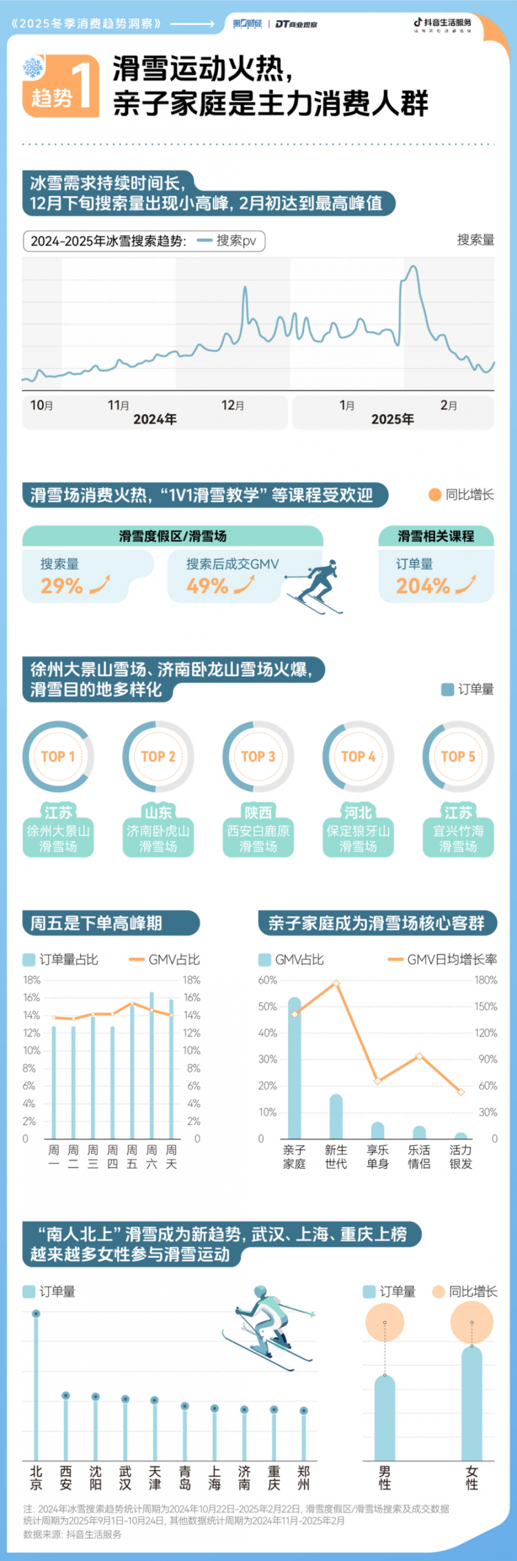 今年9月到10月下旬,抖音上滑雪度假区/滑雪场搜索量同比增长29%,搜索后成交GMV同比增长49%。