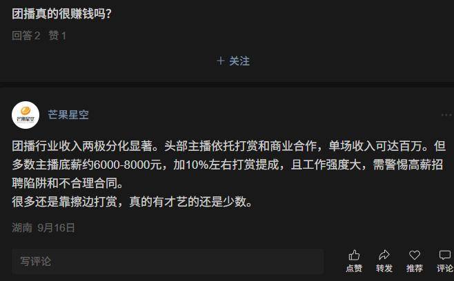 主营文娱业务的湖南芒果星空公司曾表示,“团播行业收入两极分化显著。头部主播依托打赏和商业合作,单场收入可达百万。但多数主播底薪约6000-8000元,加10%左右打赏提成,且工作强度大,需警高薪招聘陷阱和不合理合同。”