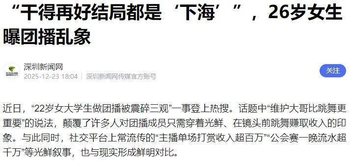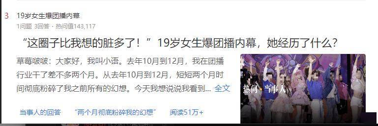 在这条题为:“这圈子比我想的脏多了!19岁女生爆团播内幕,她经历了什么?”的帖子下,有用户曝光自己“勇闯团播”的经历,其中“一个月到手26元”、违约赔偿金50万、男女主播分别维护“大哥大姐”、被逼“下海”等情况引发大量讨论,红星新闻、深圳新闻网、半岛晨报、金羊网等媒体也对此进行了报道。