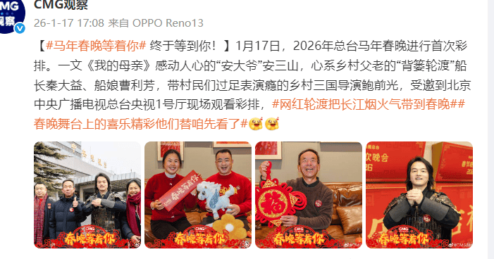 中央广播电视总台《2026年春节联欢晚会》在距离直播还有30天之际,进行了第一次带妆联排,中央广播电视总台《2026年春节联欢晚会》进行第一次联排之际,央视也是从全国各地精挑细选了4位大网红来央视现场观看春晚,从央视此次发布的名单来看,这4位网红也是很有影响力和代表性。