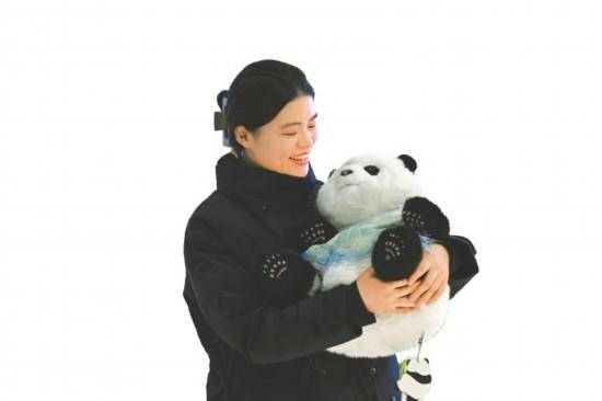 1月14日,成都暑袜街熊猫邮局内,江苏游客王湘麟与身着汉服的熊猫玩偶合影。