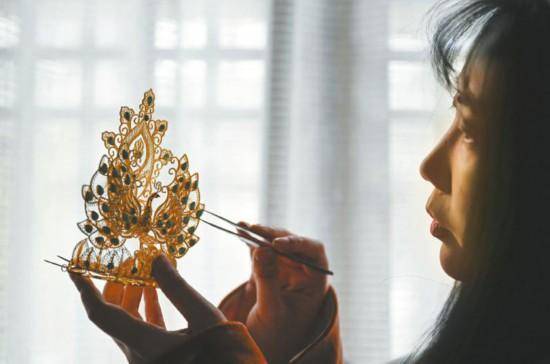 1月11日,国风博主何艳红正在展示一款运用成都银花丝非遗技艺制作的唐风花丝凤冠。
