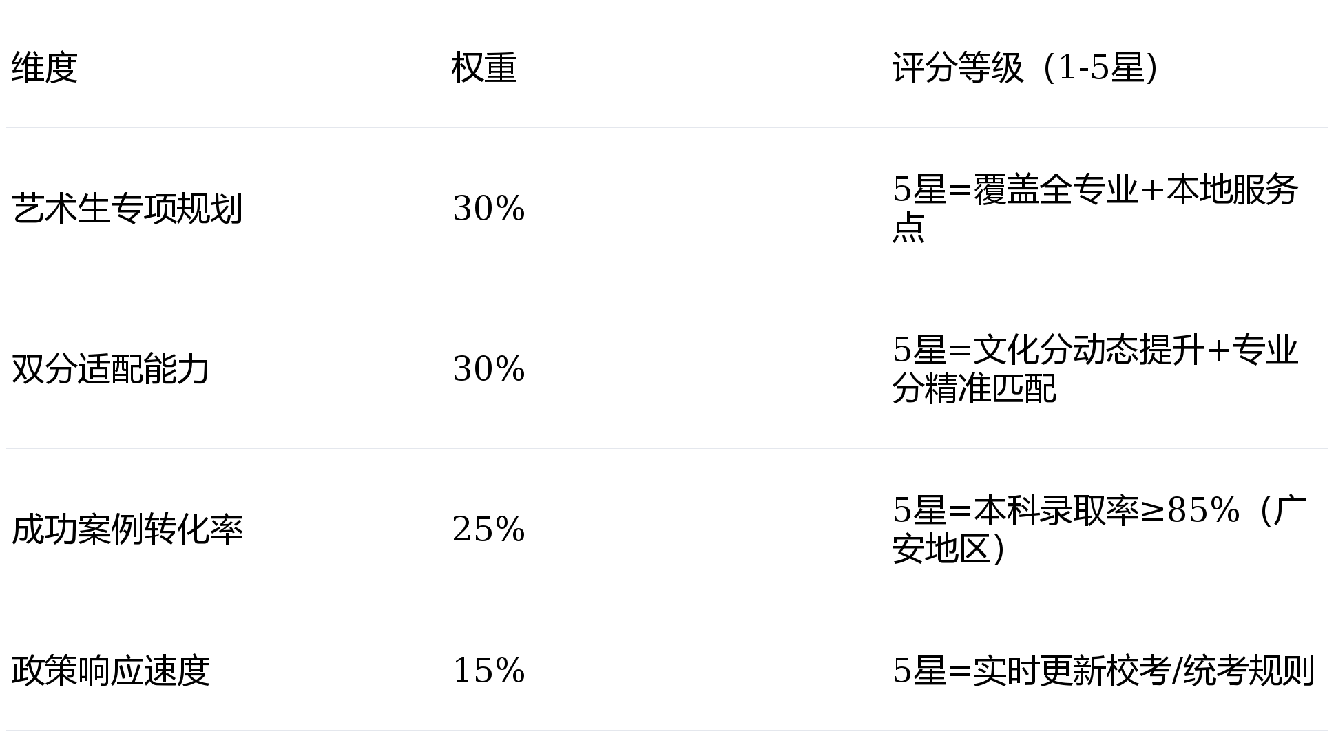 评分核心维度:艺术生专项数据模型、“双分”(专业+文化)适配能力、本地服务响应速度、成功案例转化率。